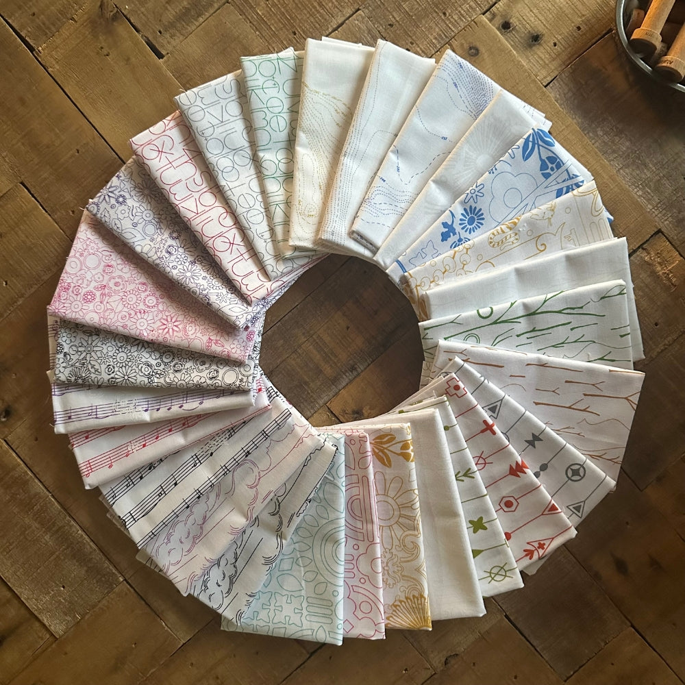 Similar in spirit to Sun Print Luminance, but this time, its entirely line work and motifs on a creamy white background—perfect for scrappy backgrounds or used individually as unique, dynamic neutrals. The spectrum of colorful line work on white backgrounds in Luminance was a longtime favorite, and I’m thrilled to now expand on that concept.