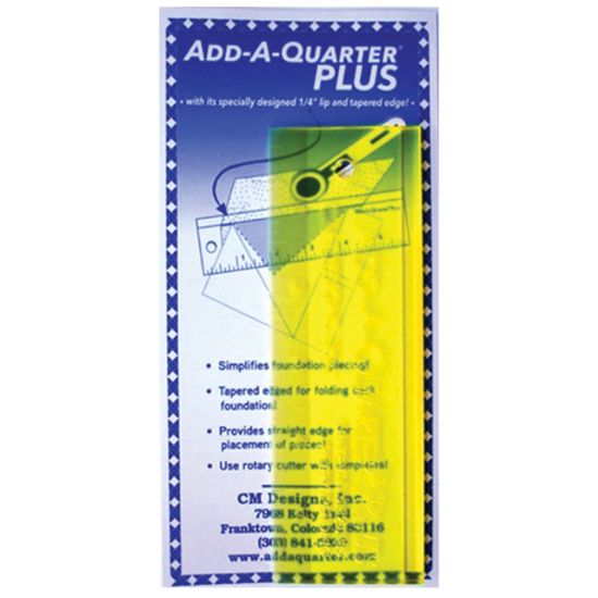 Get precise and efficient with your foundation piecing using the Add a Quarter 6" Plus Ruler! This unique tool, SKU: SC16 6 Plus, features a specially designed 1/4" lip and tapered edge, making foundation piecing a breeze. Here's what sets it apart: