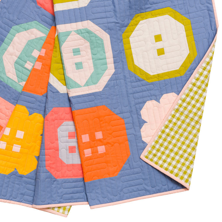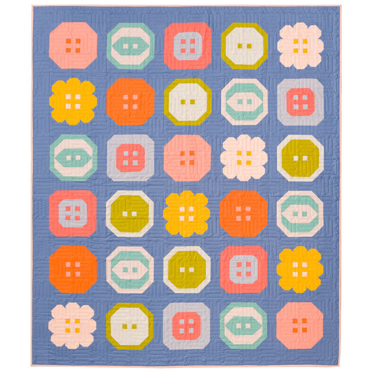 The pattern consists of five various button blocks (all finish 10" square) that are arranged randomly throughout the quilt. The 21-page pattern includes tags for organizing your cuts of fabric, downloadable coloring pages, detailed instructions, and colorful diagrams.