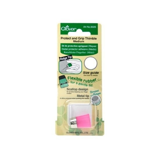 Clover Protect and Grip Thimble. Medium size 15.5mm. Flexible rubber mould with dimpled metal tip to allow pressure when pushing needle. Pink colour.