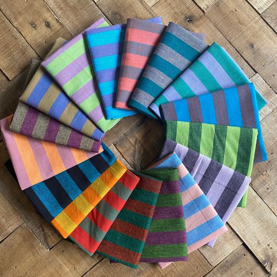 Kaffe Shot Cotton Stripes by Kaffe Fassett 100% cotton precut fabric pack consisting of 18 coordinating pieces of fabric 18" x 22" for patchwork, applique and sewing. Coordinating fabrics available. We advise against prewashing precut fabrics.