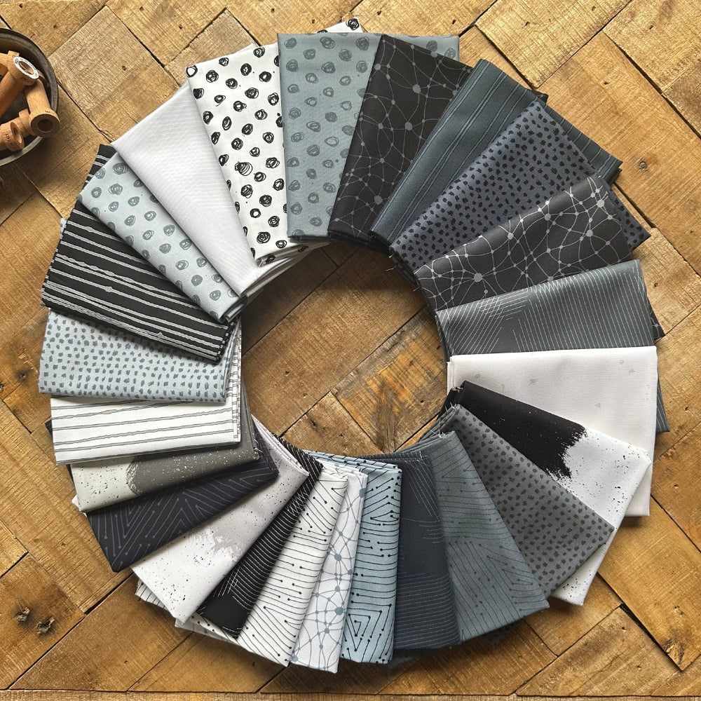 Ink by Giucy Guice 100% cotton precut fabric pack consisting of 24 coordinating pieces of fabric 18" x 22" for patchwork, applique and sewing. Coordinating fabrics available.