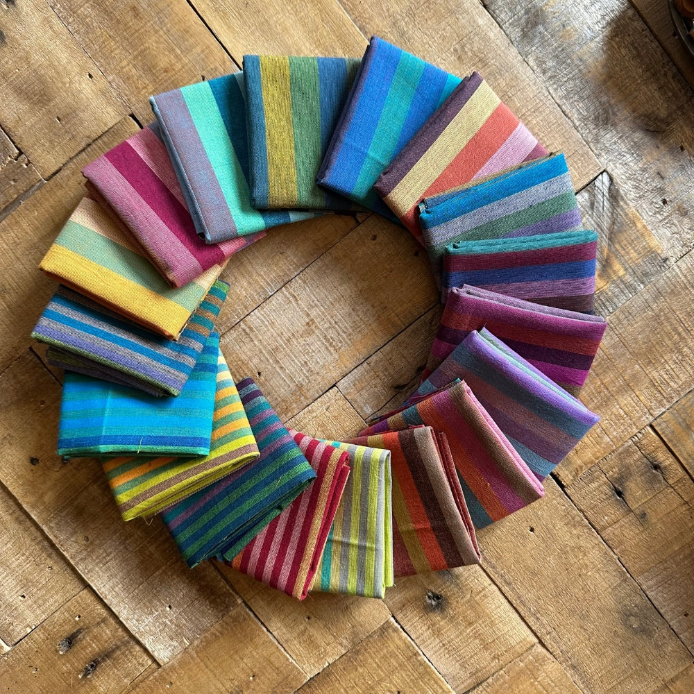 Kaffe Woven Stripes by Kaffe Fassett 100% cotton precut fabric pack consisting of 18 coordinating pieces of fabric 18" x 22" for patchwork, applique and sewing. Coordinating fabrics available. We advise against prewashing precut fabrics.