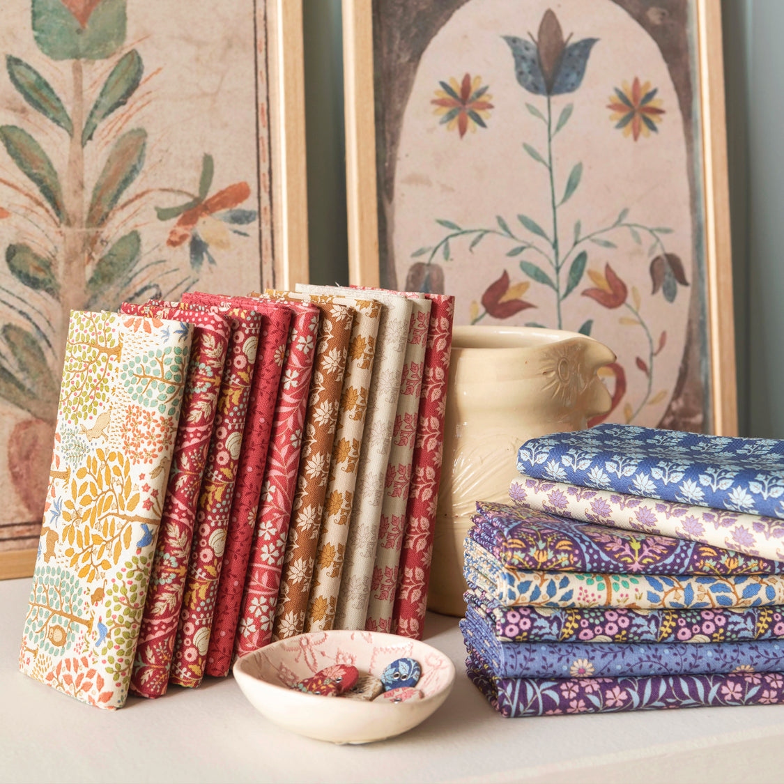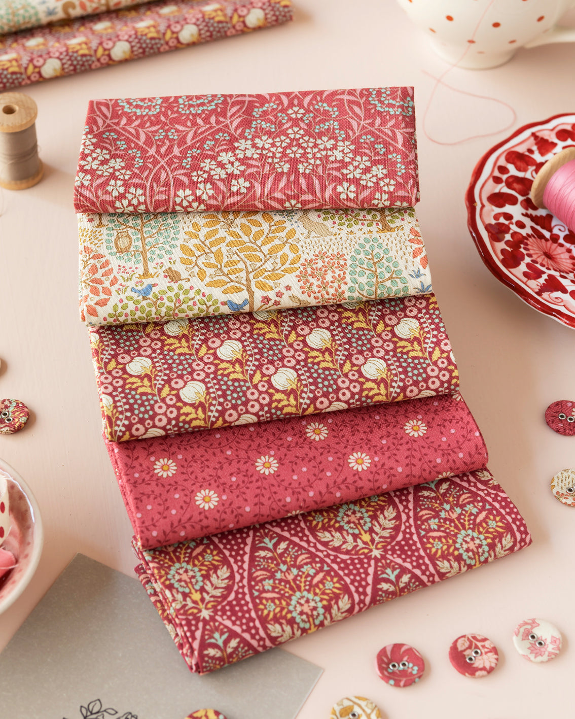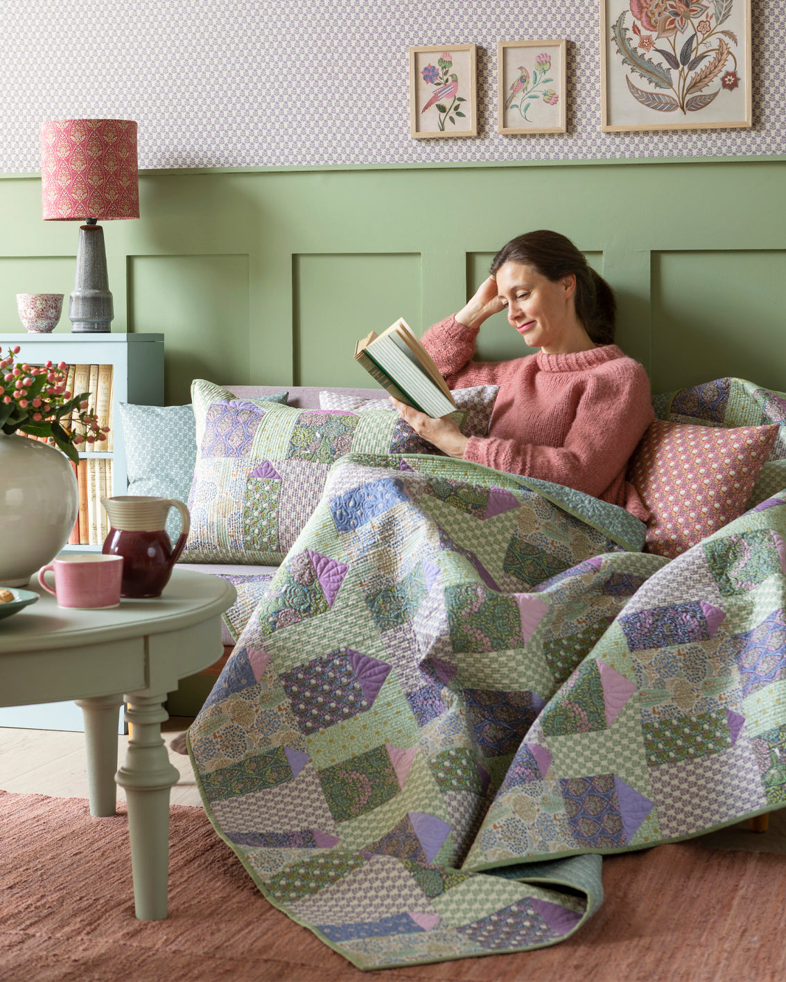 Where is your sanctuary? The woods, the sewing room, in bed with a good book? Or maybe your haven is not a specific place, but rather a more mindful escape. This soft, muted autumn/winter collection is all about feeling safe, cozy and grounded in your sanctuary. A good foundation where you can let your mind fly, dreaming of all the things you want to create and experience. Sanctuary is divided into warm and cold tones, with ornamental patterns combined with woodland scenes and florals to create a safe and homely look.My sanctuary is first and foremost my home and the nature that surrounds it, and of course escaping into the world of sewing and crafts. The Sanctuary Quilt can symbolize home or a beloved cabin. It’s a very easy quilt, great for beginners. The Paperbird Quilt and Pillows combine the love of paper with the love of fabric. In Japan, paper cranes are used as symbols of hope and peace, and although the Paperbird patterns do not specifically depict cranes, they can still represent that lovely symbolism that is so sorely needed in the world today. For so many of us, the sewing room is our ultimate sanctuary. This sanctuary is depicted in the Make Do and Mend Quilts.
