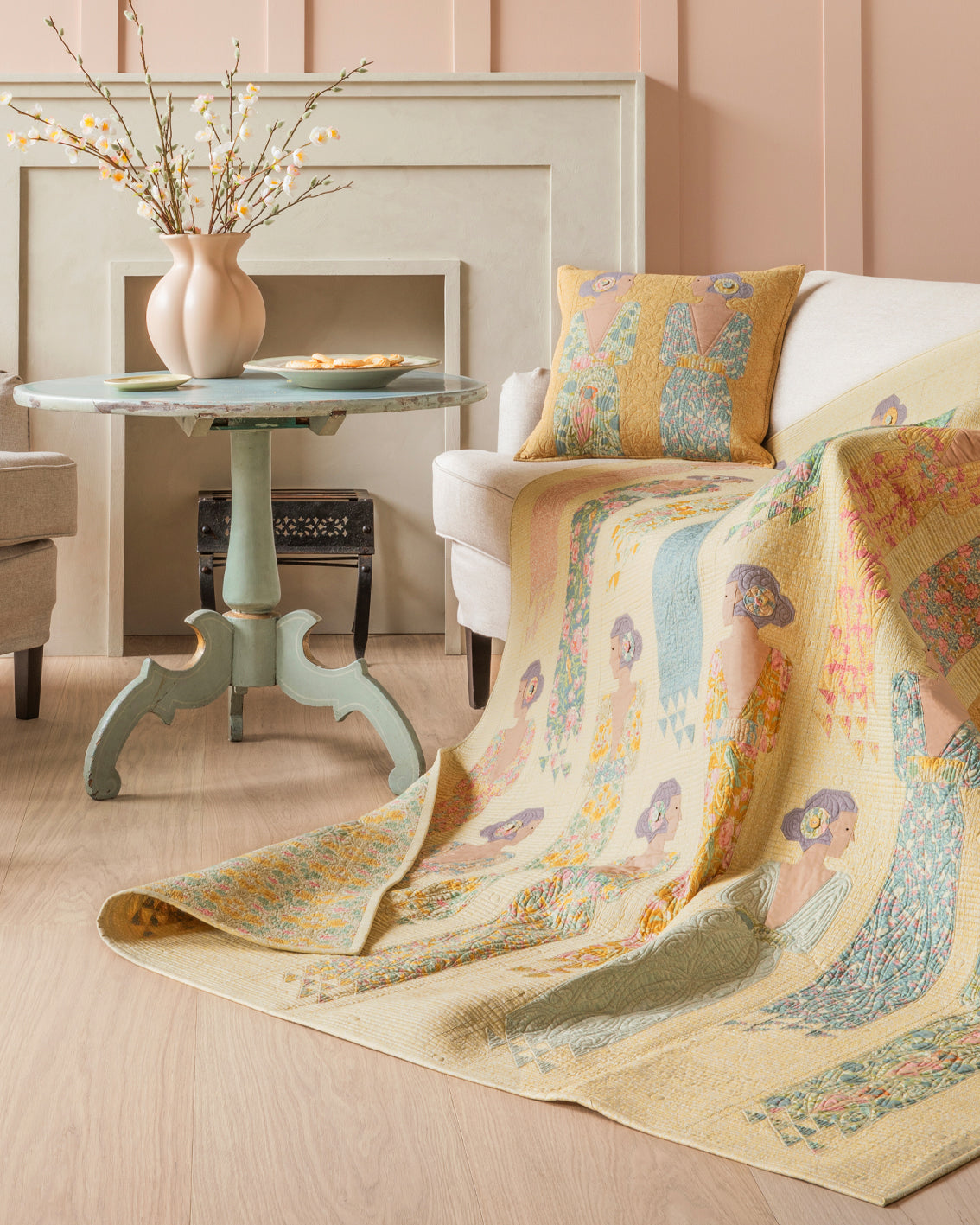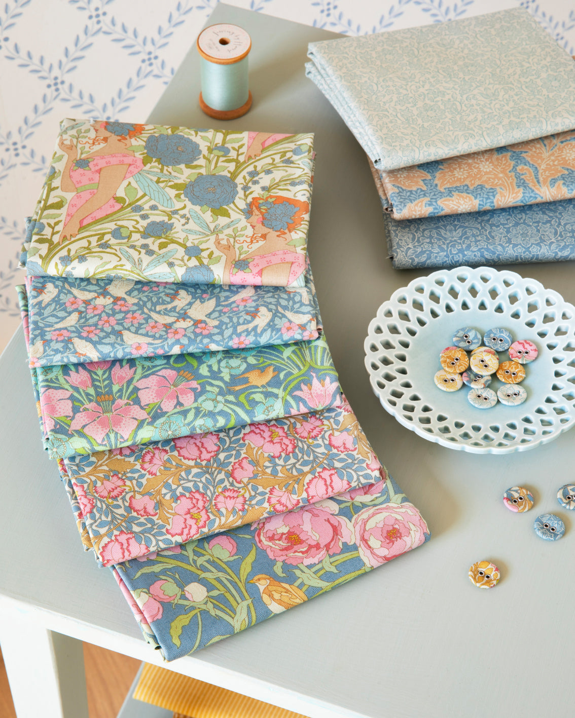 A trip to Venice inspired the Songbird collection with its references to the Art Nouveau style. The Stile Liberty can be found in ornate buildings and old cafes around town, glass chandeliers, hidden gardens and the romantic way of life. The hand-drawn patterns of Songbird are a sweet nod to the more elaborate designs of Art Nouveau, presented in classic light, naive Tilda style. The colour palette has a soft, pastel feel, which gives the collection a beautiful woatercolur effect. This is a collection for those who love light and delicate fabrics and is perfect for spring and summer.