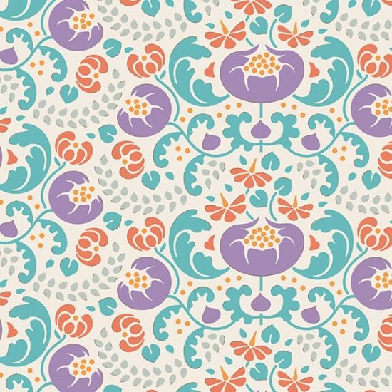 LazyDays is inspired by florals from both the Art Nouveau and Art Deco movements. With the cool blues and teals combined with lilac and coral red, its a beautiful collection for a sweet yet decadent summer.