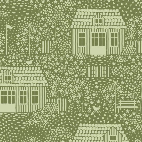 Hometown My Neighborhood in Moss Fabric 100% cotton fabric for Tilda. 112cm wide. Coordinating fabrics and precuts available.Home is where the heart is, and perhaps never more so than now for many of us. Hometown is a cozy collection where the love of home and community has been the main inspiration. Drawings of neighborhoods, houses, gardens and gatherings in Autumn and Winter colors are perfect for your homey quilts and projects.