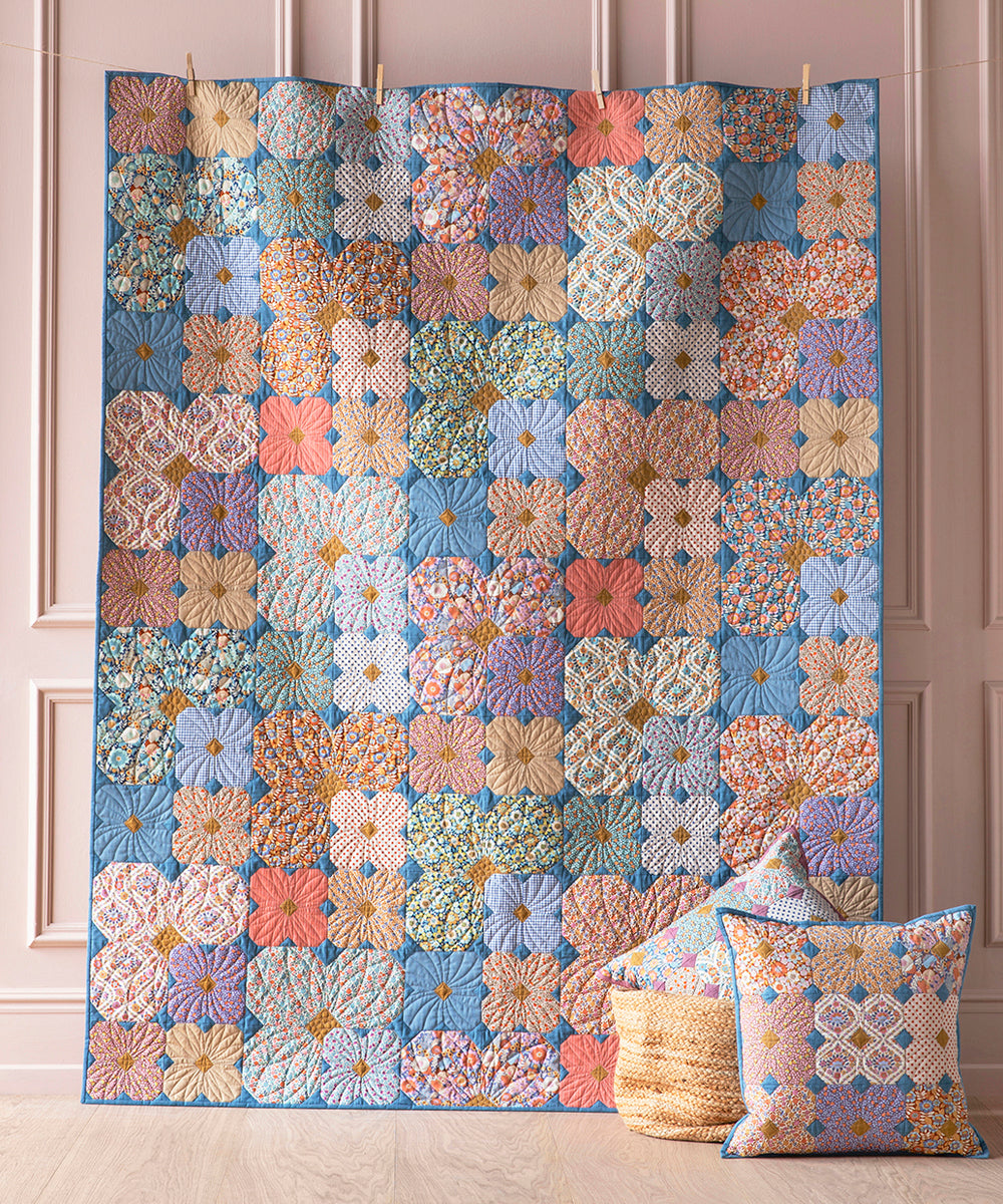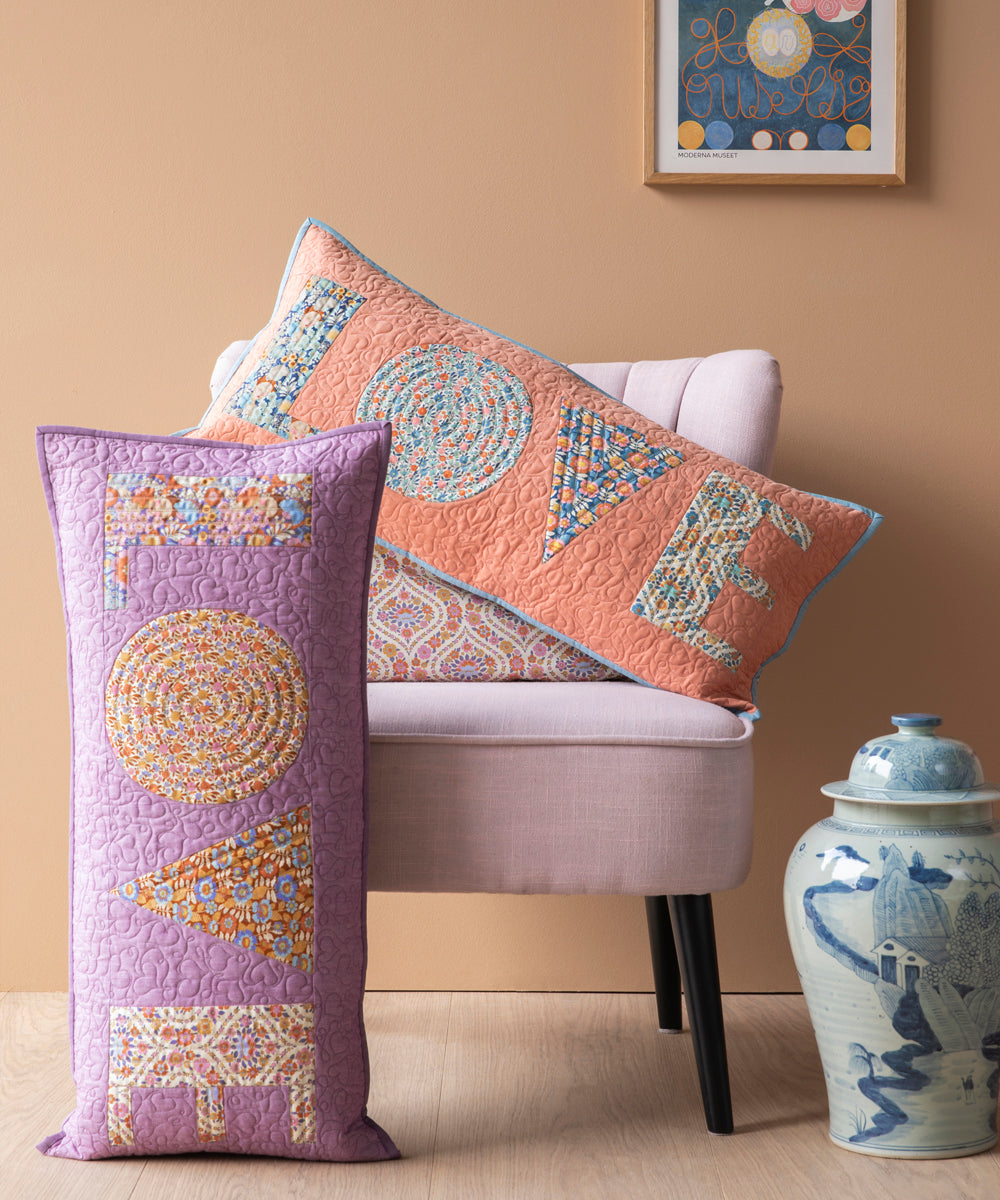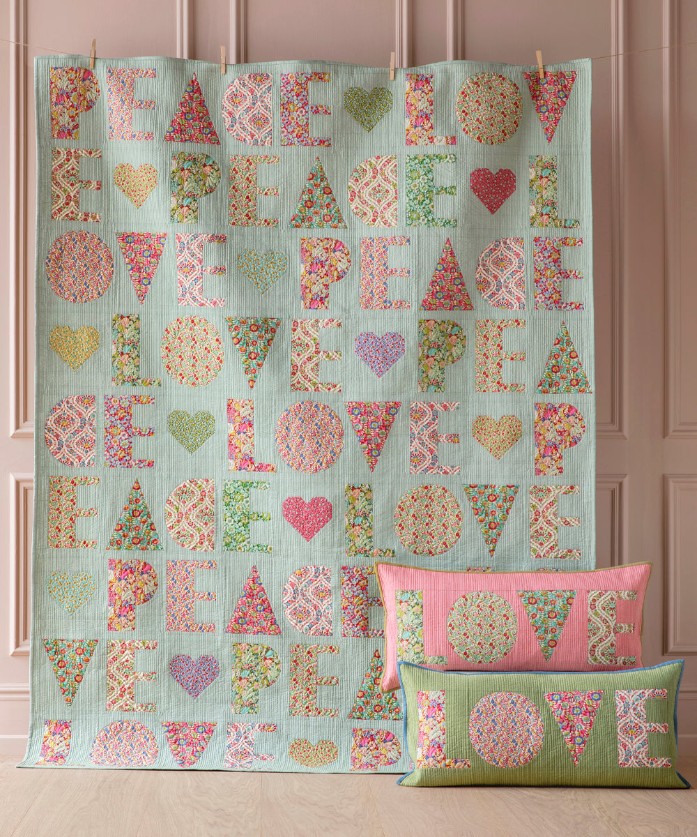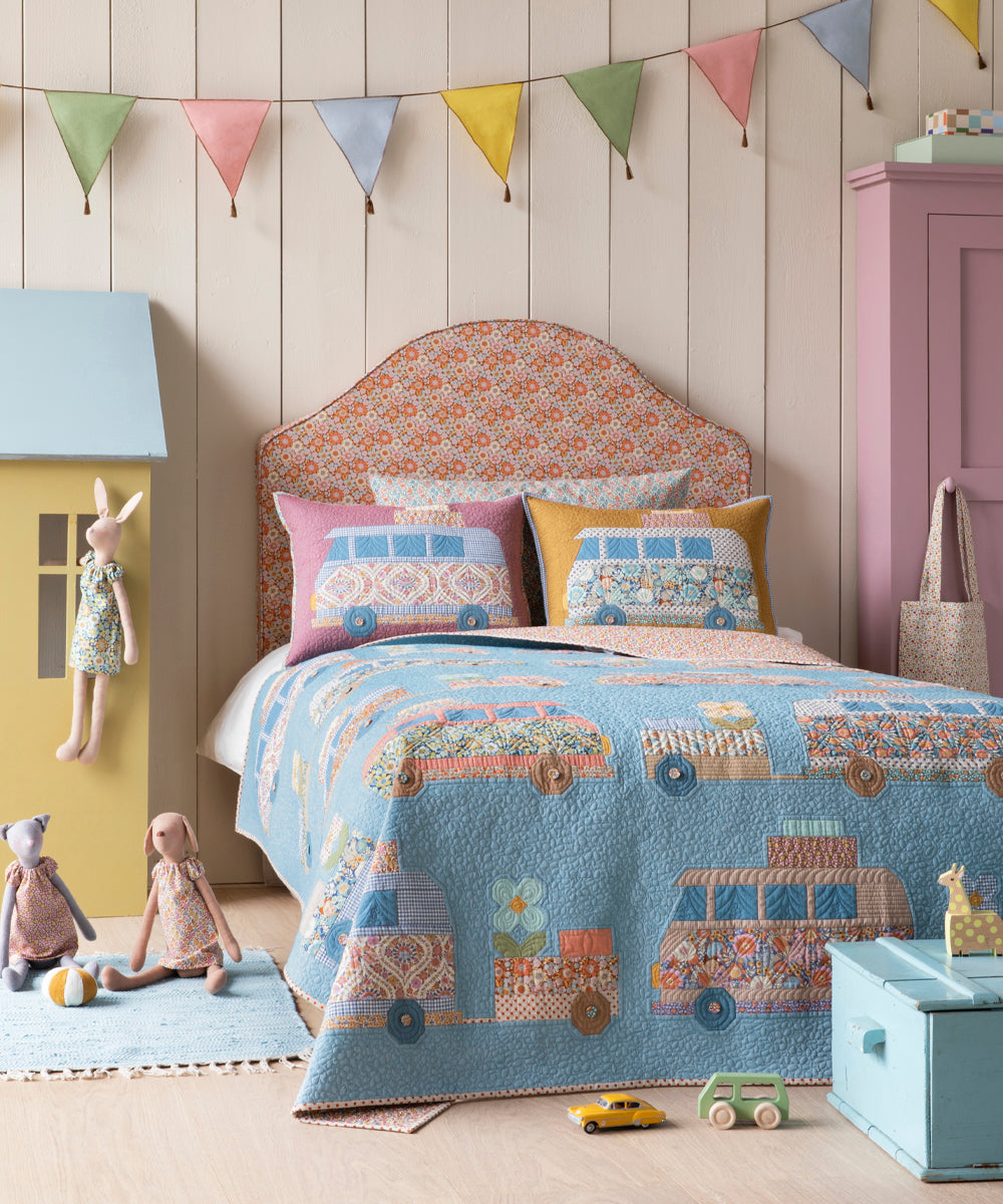 Wallflower is an ornamental collection loosely inspired by, and my somewhat romantic take on design styles popular in the 1960s and 70s. The name Wallflower takes me back to dancing school, at a time of my life where I was taller than all the boys and therefore doomed to be a wallflower. The ballroom had a distinctive 1970s floral wallpaper that I tried my best to disappear into, much like the shy girl in the Wallflower fabric design. Given the state of the world at the time this collection was designed and the inspiration behind the fabrics, it seemed fitting to promote some good thoughts through the naive but heartfelt Peace and Love quilts. The era also inspired the cute Campervan quilt designs where buttons are used as decoration on the wheels, and, of course, a whimsical flower quilt is a must. The collection has two distinctive color stories. One is sweet and fresh with vintage reds, greens and pinks with hints of blue and sour yellow. The other is more of a nod to the 1960s and 70s, with caramel, blue, ginger, ochre and thistle tones.