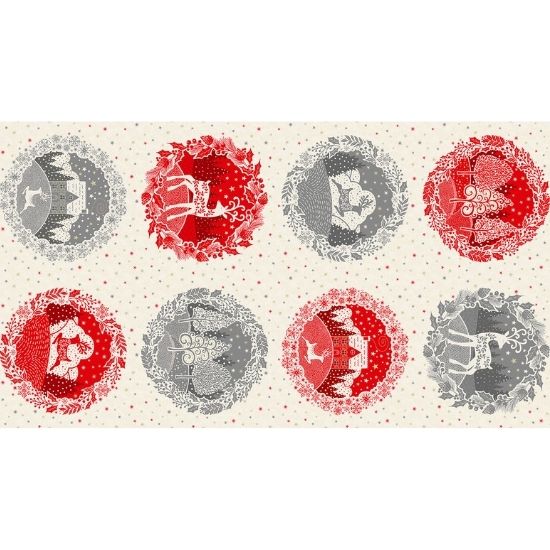 Scandi 2021 Circle Panel in Multi 100% cotton for Makower UK. Scandi 2021 features new double borders ,circle panel and an updated mini stocking advent panel in traditional reds and greys, with metallic detailing. 44" wide machine washable. Perfect for patchwork, applique, bags and clothing. Coordinating precuts and fabrics available. Panel measures approx 56cm x WOF.