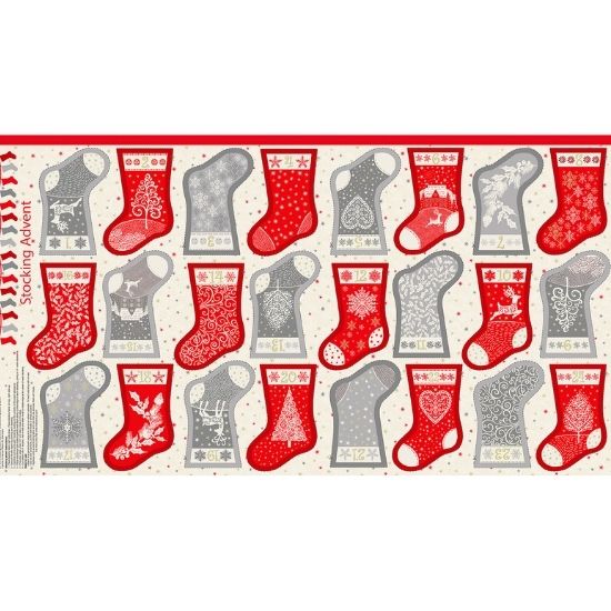 Scandi 2021 Mini Stocking Panel in Multi 100% cotton for Makower UK. Scandi 2021 features new double borders ,circle panel and an updated mini stocking advent panel in traditional reds and greys, with metallic detailing. 44" wide machine washable. Perfect for patchwork, applique, bags and clothing. Coordinating precuts and fabrics available. Fabric Panel measures 60cm x WOF.
